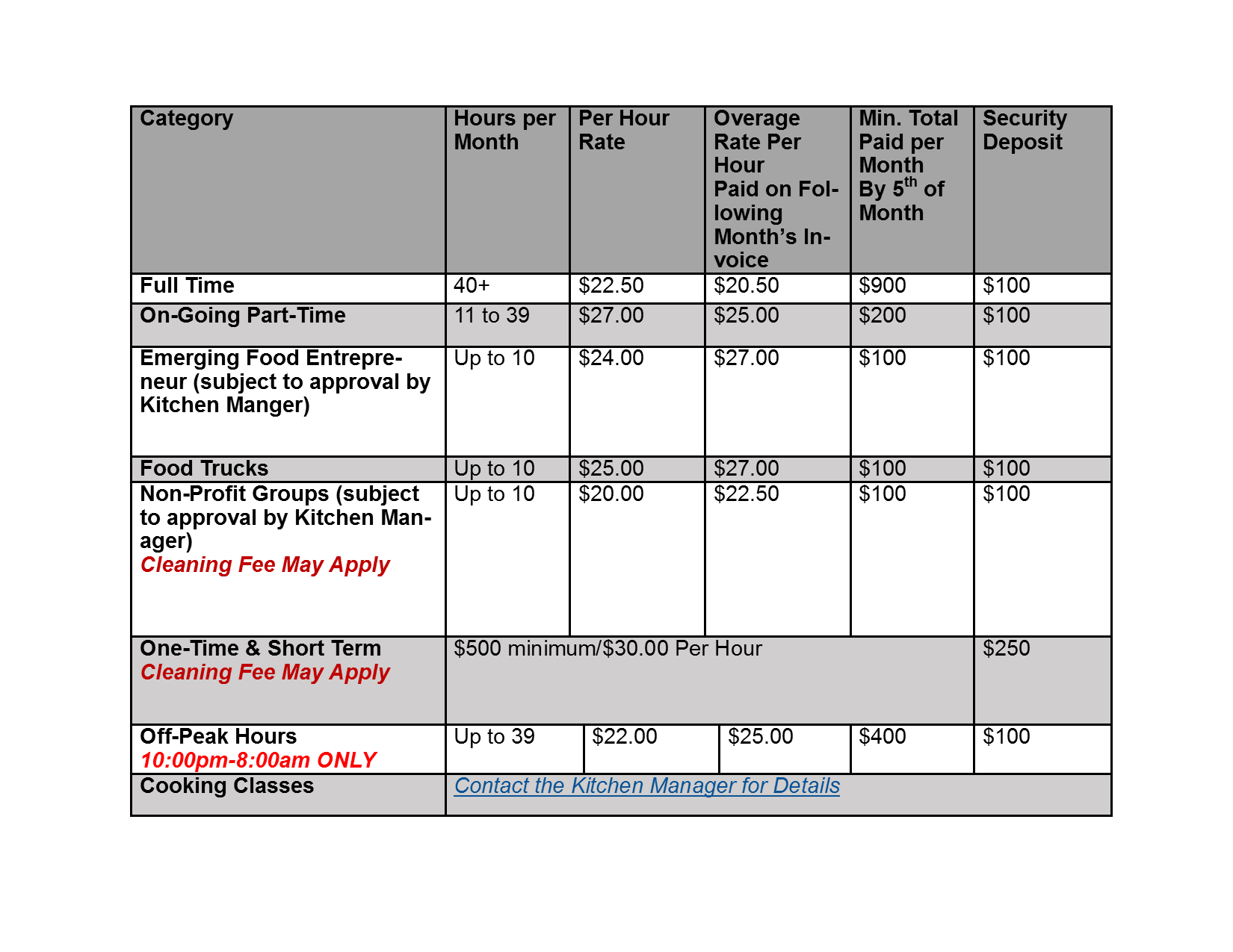 Fee Options Table - Chiknegg